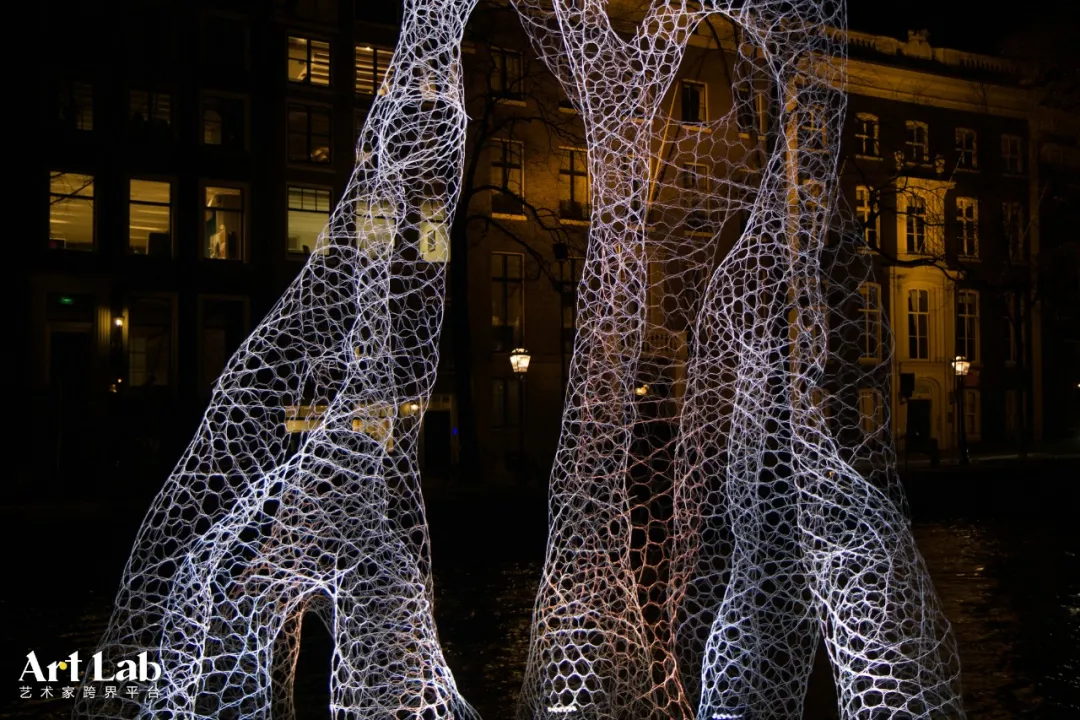 作品呈现出一棵发光的树的形象,它由无数条明亮光线构成,形成了树干和树枝的网状轮廓。这些光线在夜晚中显得格外醒目,仿佛是一棵生长在城市中的神秘生物。
