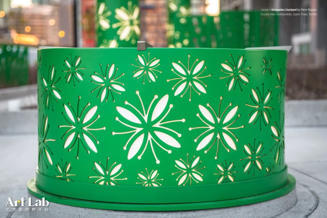 庭院内设有一系列激光切割的灯光柱、定制的公共座椅、挡风屏和特色LED墙花。