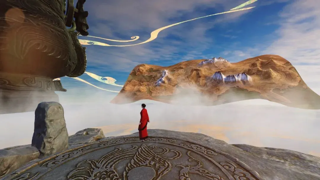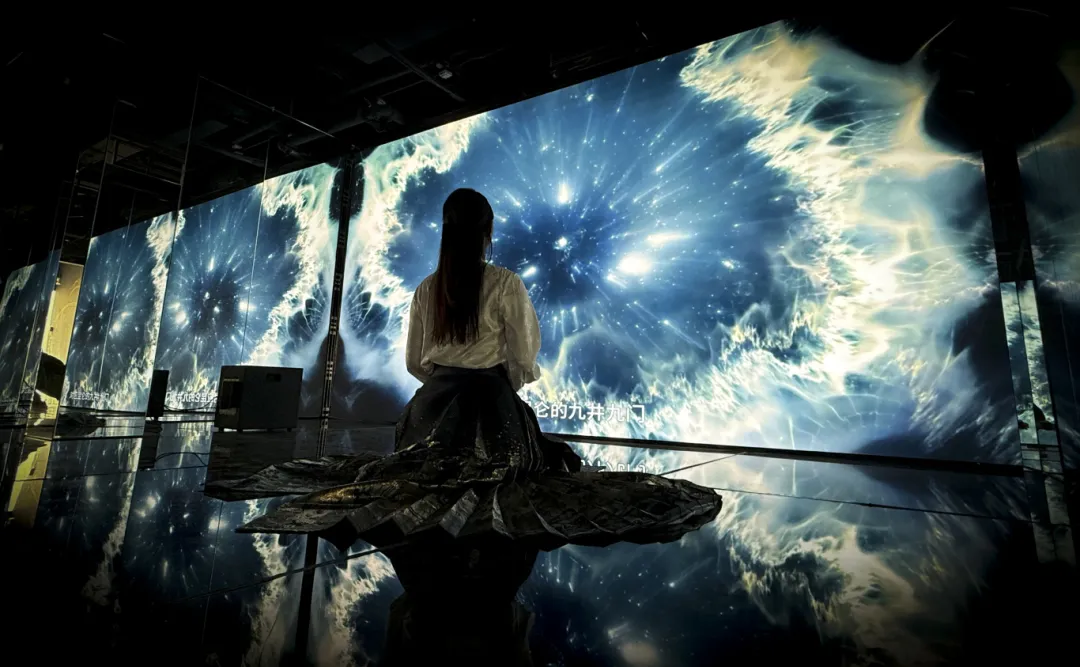 “山河永存”以三清殿琉璃正脊为中心,通过沉浸式互动投影,呈现永乐宫自元代以来,与山河共存、随岁月更替的时空图景。展览结尾还结合VR技术打造“幻游永乐”沉浸式体验项目,融合数字交互,整合建筑、壁画与历史文化,带领观众在虚拟场景中探索永乐宫的奇妙宇宙。